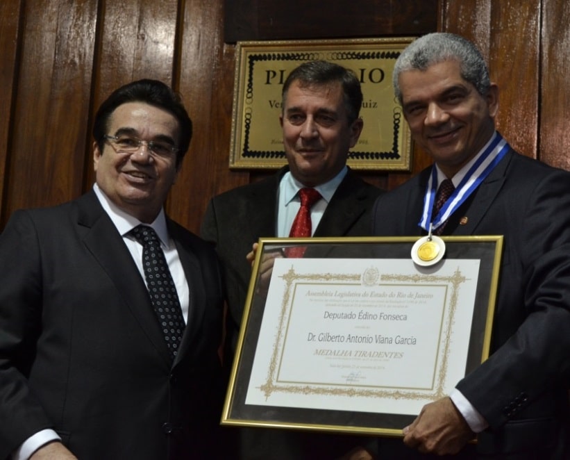 atghtrhO advogado Gilberto Garcia foi agraciado com a Medalha Tiradentes, a mais alta comenda da Assembleia Legislativa do Estado (Alerj). A iniciativa foi do ex-deputado estadual Édino Fonseca. A entrega aconteceu na Câmara Municipal de São João de Meriti, cidade onde o advogado atua há 30 anos. Na foto, Gilberto Garcia com o ex-deputado Édino Fonseca (à esquerda) e o presidente da Câmara, o vereador Carlos Roberto Rodrigues.