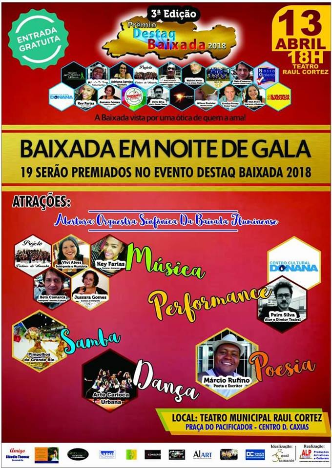 “Em 2018 o Prêmio “Destaque Baixada” , em sua terceira edição, escolheu 19 projetos de destaque na região, além de homenageados. Na seleção constam desde atores, cantores, dançarinos e instituições culturais, sendo que, a grande noite de entrega dos troféus e homenagens ocorreu, dia 13 de abril, no Teatro Municipal Raul Cortez, Duque de Caxias/RJ.