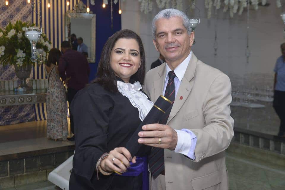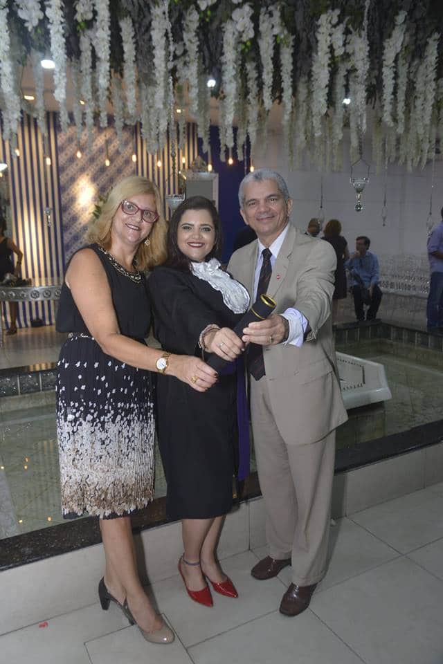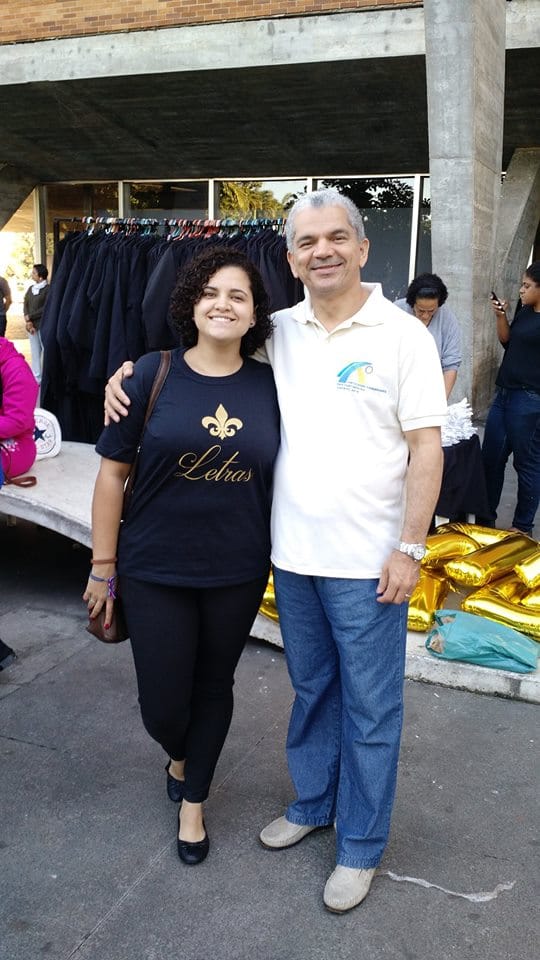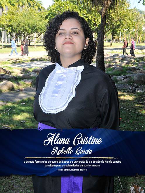 estou indo em direção a conclusão de mais uma etapa na minha vida. Neste lugar conheci pessoas de todos os jeitos e fiz amizades, participei de eventos que serviram para meu crescimento acadêmico e também levei comigo conhecimento adquirido com professores dedicados. Agradeço a Deus pela oportunidade de ter me colocado na UERJ e espero ter sido benção na vida daqueles que passaram por mim. Ainda assim agradeço a Deus por ter me dado forças para enfrentar as crises da UERJ, as greves, entre outras adversidades, e poder, hoje, estar concluindo com excelência este curso tão renomado. Obrigado, a mim mesma, por ter passado tantas noites estudando, tentando me dedicar e resistindo. Agora é a hora de aproveitar o que foi conquistado até agora e levar comigo aquilo que me fez bem. Espero poder exercer a minha profissão de acordo com meus princípios e ajudando aqueles que buscam conhecimento com sua jornada. Como professora, e também educadora, espero ser benção na vida daqueles que ainda passaram por mim. Que Deus continue sendo o centro da minha vida para que eu possa fazer tudo da melhor forma possível, como Ele faria. “Consagre ao Senhor tudo que você faz, e seus planos serão bem-sucedidos”. Prov. 16:3. Os pais também ficaram felizes por ela ter sido escolhida pelos colegas formandos para ler o “Juramento – Juro buscar, na essência das palavras, a interação e a paz entre todos, seja lecionando, traduzindo, pesquisando, criticando, ou mesmo conversando. Juro fazer mais que educar. Dignificarei minha profissão e serei para meus alunos um exemplo de luta pela procura da sabedoria. Como profissional das Letras, terei como ferramenta a Língua. Procurarei valorizar as várias culturas. No estudo e ensino de línguas e literaturas, juro promover o intercâmbio de ideias, conscientizando cidadãos e fazendo-me um eterno aprendiz da vida”.